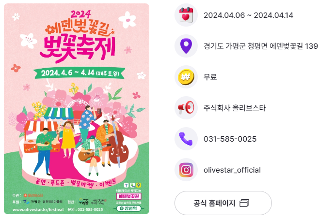 2024 에덴벚꽃길 벚꽃축제는 천혜의 자연 가평의 벚꽃터널을 볼 수 있을 뿐만 아니라