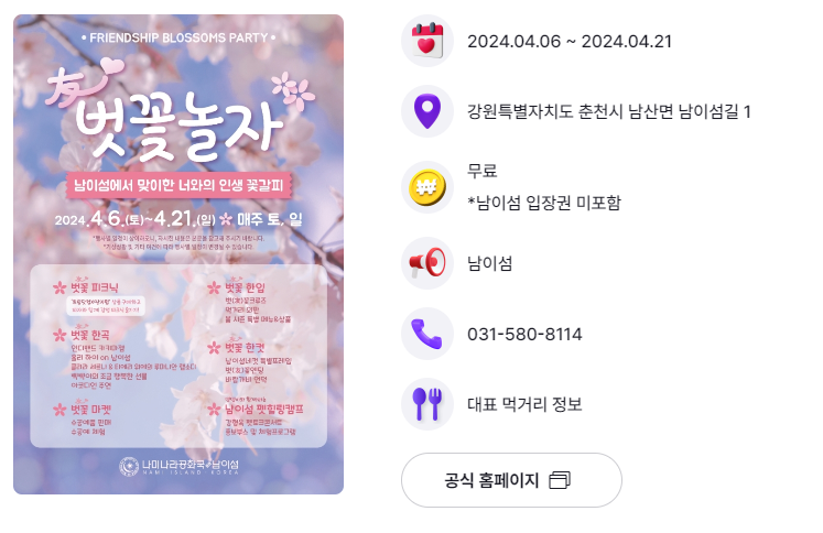 행사 기간 내 남이섬에선 봄 시즌 특별 메뉴인 「벗(友)꽃 한 입」과,